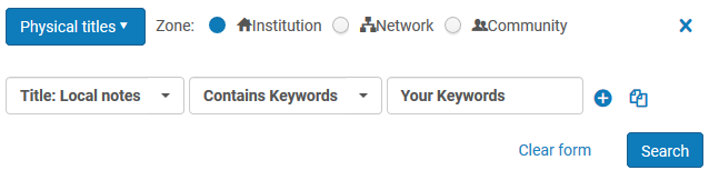 using contents of a local note field Physical Titles Advanced Search: Title: Local Notes – Contains Keywords – [keywords]