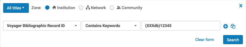 using a Voyager bib id Physical Titles Advanced Search: Voyager Bibliographic Record ID – Contains Keywords – [(XXXdb)nnnnn]