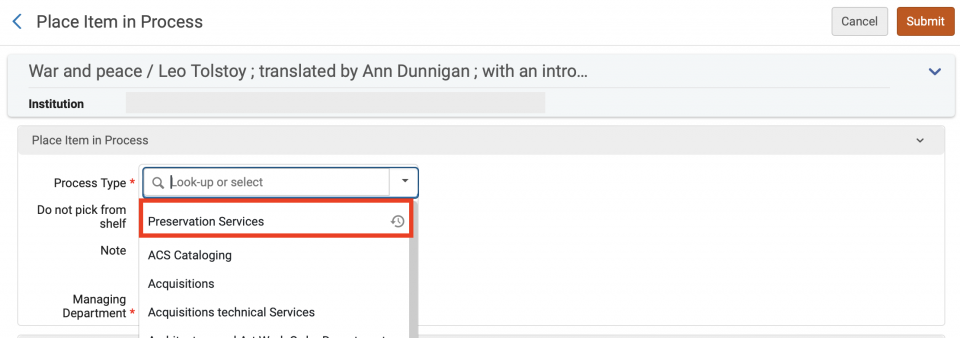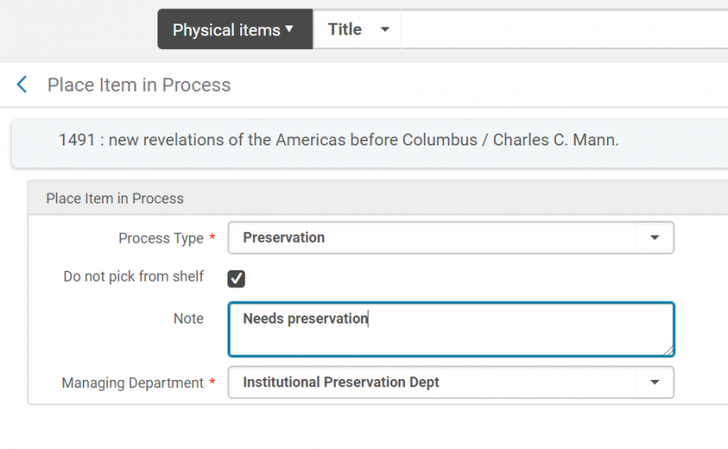 Note: Item records must have a shelf status of "Item in place" in order to have the Missing status assigned manually.