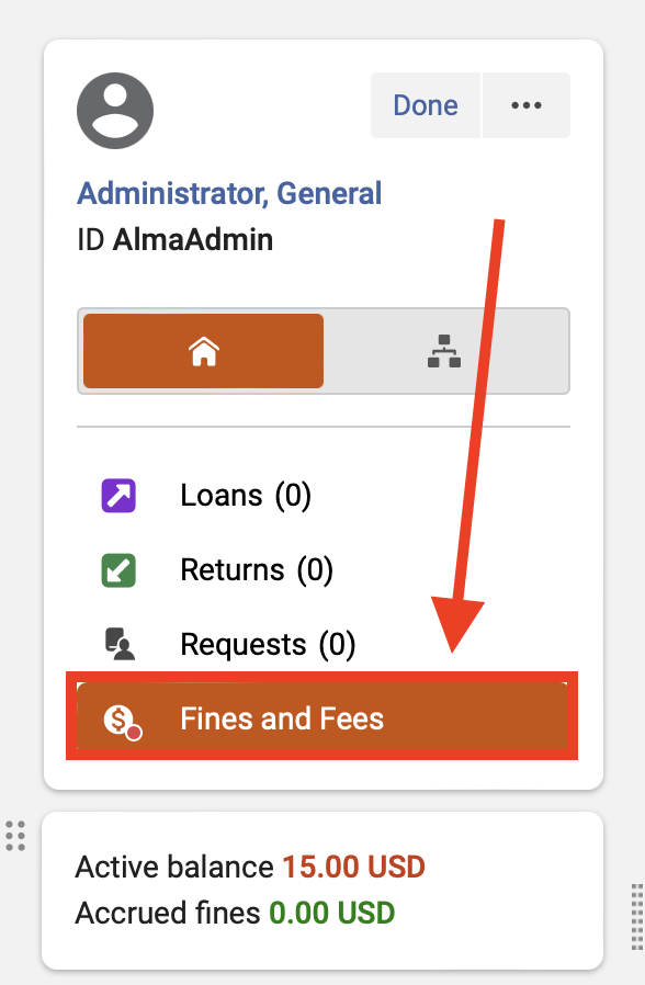 A patron may have questions about notifications about fines and fees. To review what notifications were sent to the patron, click the "Attachments" tab of the User Details screen.