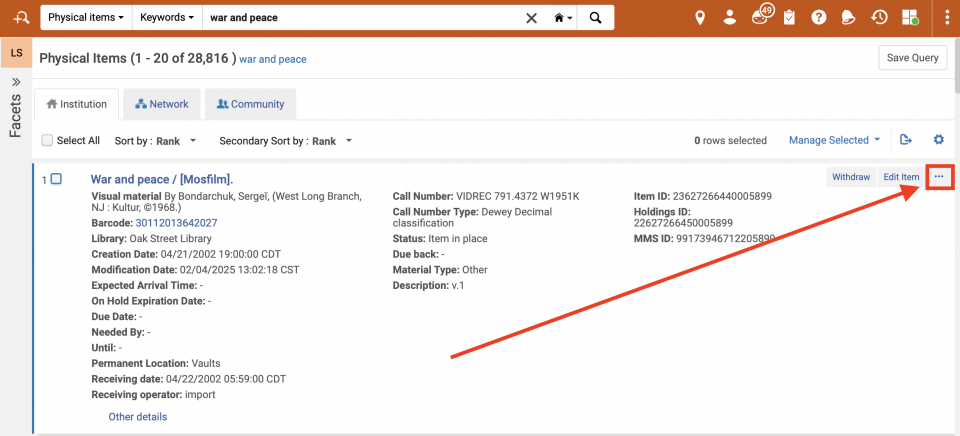 Moving an item in Alma allows you to update the record to reflect physical changes to an item's location. As an example, this is the process you should use when relocating an item from one library to another.