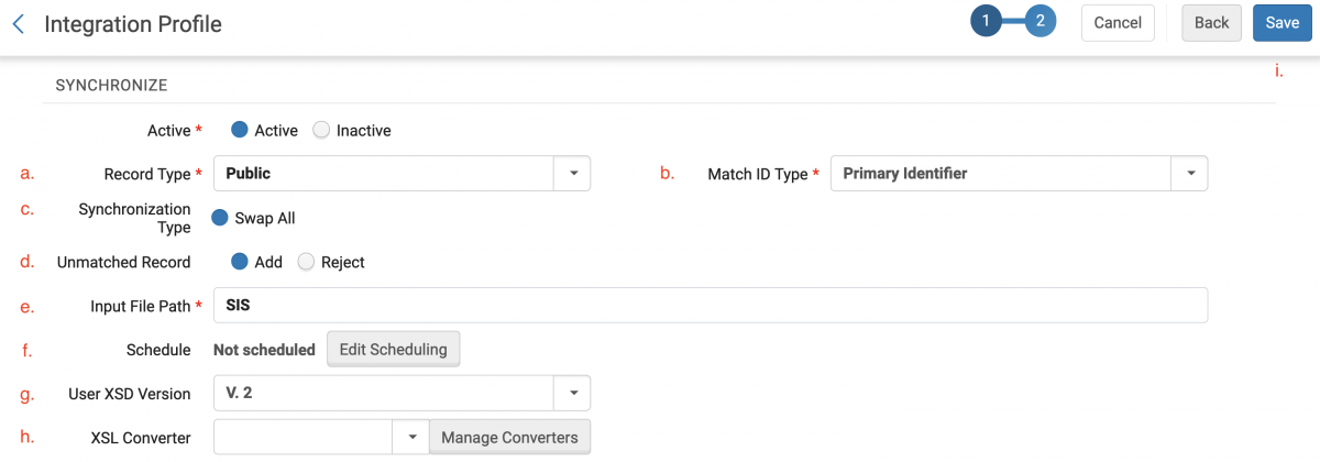 - On the second Integration Profile screen, you will enter the details for the specific type of SIS integration you are creating. You will use only one type per integration. Mark the choice you will use in this integration as Active; other types should remain inactive. This documentation will focus on the Synchronization settings.