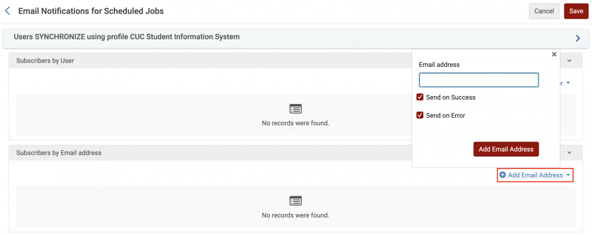 - Click the more actions button (...) at the right of the "Users SYNCHRONIZE using profile CUC Student Information System" entry and select "Email Notifications" from the drop-down list (see Screenshot 13 below).