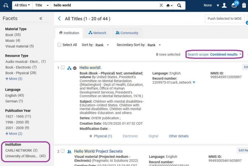 CARLI is testing out Alma search functionality that allows you to see shared Network resources in an institution zone search. The option of Combining Institution and Network Zone Search Results is currently active in the premium sandbox for University of Illinois Chicago. CARLI staff believes that all institutions will want to implement this option, so we invite library staff to test and comment on this functionality. CARLI staff plan to request this change for libraries in August 2022.