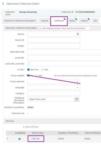 In Alma, the best practice for proxy redirection is to use an unproxied resource URL in the portfolio, and associate a proxy from those configured with the electronic service level. Alma automatically applies the proxy string as the portfolio is presented to users. Removing proxy strings from URLs is a recommended step to take during P2E clean-up. If you have not yet performed this task, you will need to modify your portfolio URLs before you may apply the new proxy.
