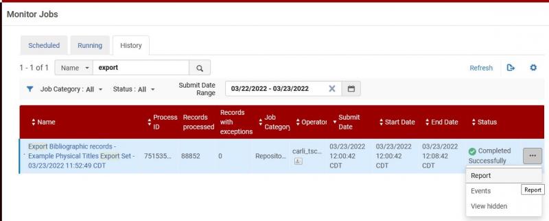 - Locate your export job on the list. Depending on activity at your institution, your job may be in another position in the list, so you might use the filter box to find your job name. Click the actions menu (...) button, then select Report.