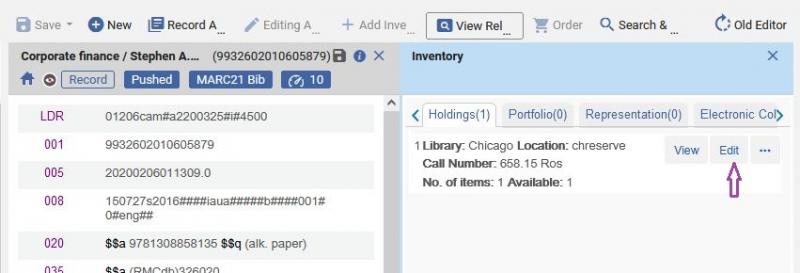 6. You will see each holdings record present for the bib record. Click the Edit button.